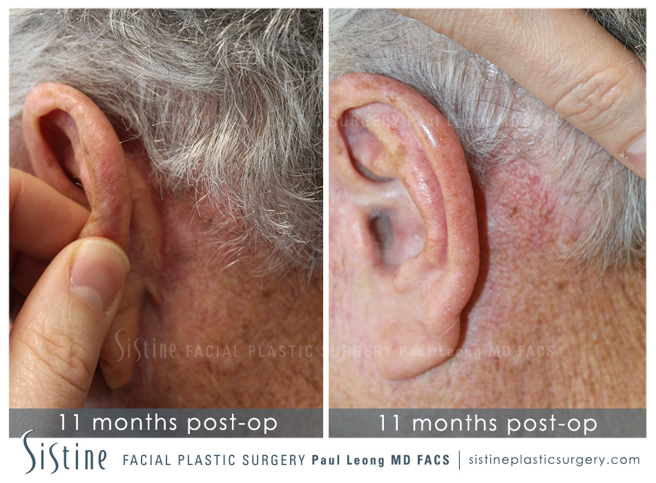 Male facelift patients are very concerned about the quality of their incisions, and rightly so given their lack of hair to hide the evidence of the surgical procedure. As you can see in these pictures, the patients incisions have healed beautifully. Dr. Leong’s goal is that the incisions should not be visible even under close viewing. Just as important as how invisibly the incision heals is making sure that the location of the incision does not change the position of the sideburn or the hairline behind the ear. As you can see, the patient’s hairline position is completely unchanged and totally natural.