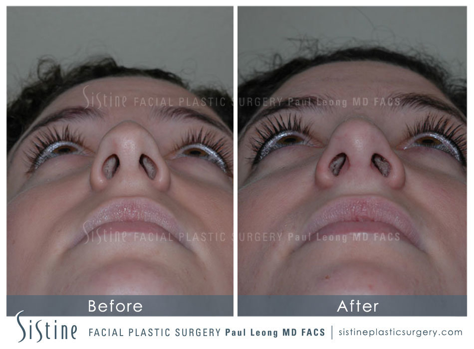 The changes on the frontal view for this patient are modest because she was quite happy with the frontal view. This view demonstrates subtle refinement of the nasal tip and modest tilting upward of the nasal tip (the surgical term is nasal tip rotation).