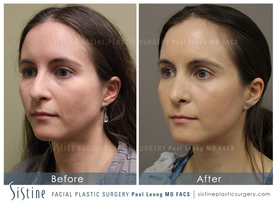 In addition to the profile view, which shows the reduction in the height of the dorsum, this is probably the most important view. Please note that the bridge of the nose has been straightened. In the pre-op view the bridge leans a little to the left. In the post-op view the bridge is straight and the symmetry in nicely improve. Rhinoplasty surgeons call the gentle curve from the central part of the brow to the nasal tip the brow-tip aesthetic line. Her post-op brow-tip aesthetic line is excellent. Furthermore, her nasal tip is more refined and symmetric.
