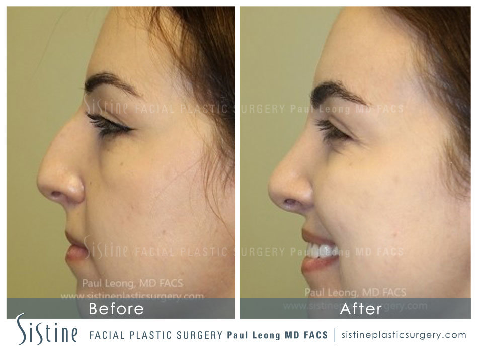 Her dorsum is reduced in height and her tip has been rotated slightly upwards. The angle at her nasal spine is less rounded. The angle at the nasal spine is the angle at the meeting point between the upper lip and the columella (the strip of tissue between the nostrils). It is preferred that this angle be sharper as opposed to more blunted, a change that was accomplished with her surgery.